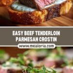 Beef Tenderloin Parmesan Crostini is an elegant appetizer featuring seared slices of tender beef on crispy baguette rounds, topped with a rich and creamy Parmesan sauce, fresh herbs, and optional greens for a flavorful and sophisticated bite.