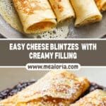 Delicate and delicious Blintzes featuring thin crepe-like pancakes filled with a creamy cheese filling. Perfect for breakfast or dessert and customizable with various toppings like berry sauce, fresh berries, or whipped cream.