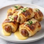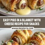 Pigs in a Blanket with Cheese are delightful bite-sized snacks featuring mini sausages and gooey melted cheese wrapped in flaky puff pastry. Perfect as an appetizer or party treat, these savory rolls offer a satisfying combination of flavors and textures with a golden, crispy exterior.