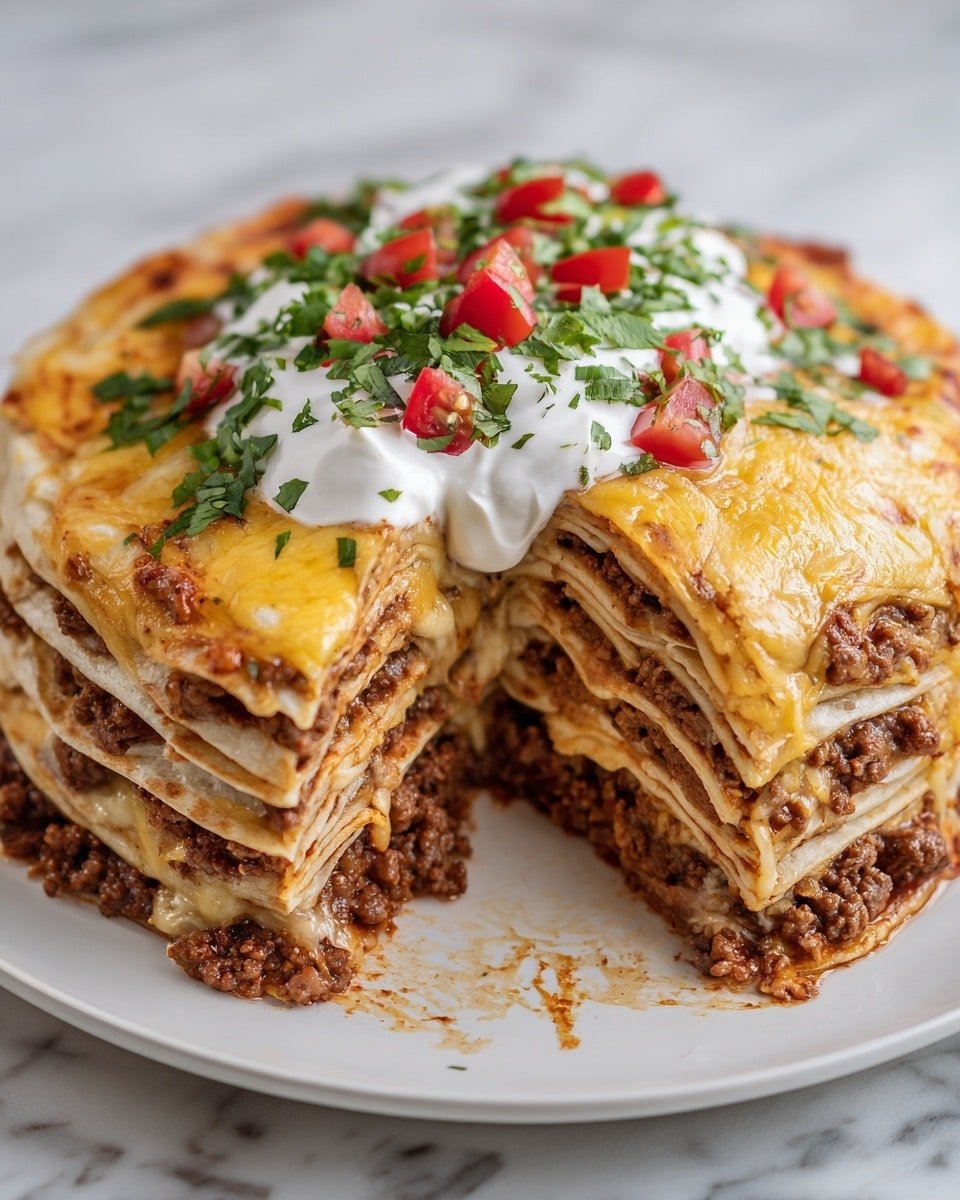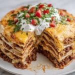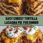 This Cheesy Tortilla Lasagna Pie is a delicious, layered casserole combining seasoned ground beef or turkey with Mexican-inspired spices, layered between soft tortillas and gooey melted cheeses. Perfect for a comforting dinner, this savory pie blends the flavors of lasagna and a taco filling, baked to golden perfection and topped with creamy sour cream or ricotta.