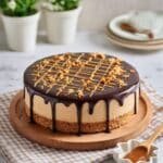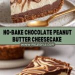 This decadent no-bake Chocolate Peanut Butter Cheesecake features a buttery graham cracker crust, a creamy peanut butter cheesecake filling made with cream cheese and Greek yogurt, and a rich chocolate ganache topping. Finished with an artistic marbled peanut butter design, this dessert is perfect for chocolate and peanut butter lovers looking for an impressive yet easy-to-make treat.