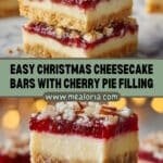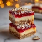 These festive Christmas Cheesecake Bars feature a buttery sugar cookie crust topped with a creamy cheesecake layer, vibrant cherry pie filling, and a crunchy almond crumble. Perfect for holiday gatherings, these bars combine classic flavors with a delightful texture contrast for a crowd-pleasing dessert.