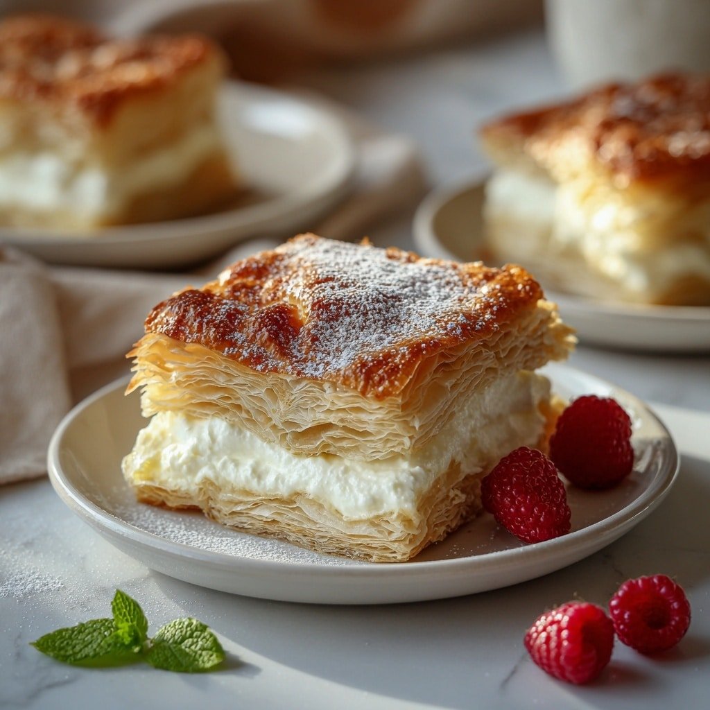 A square piece of layered pastry dessert is placed on a white plate on a white marbled surface. The dessert has four layers: the top layer is golden brown and crispy with a textured, flaky appearance and a dusting of powdered sugar. Below it are two pale, thin, flaky pastry layers with visible folds. Between these layers is a thick, creamy white filling that looks smooth and soft. On the plate beside the dessert are two fresh red raspberries and a small green mint leaf, adding a pop of color. In the background, more pieces of the dessert are partly visible on white plates, slightly out of focus. The setting features soft natural light, creating a warm and inviting atmosphere, photo taken with an iphone --ar 1:1 --v 7 — Cinnamon Cream Cheese Crescent Roll Casserole, breakfast casserole with cinnamon and cream cheese, easy brunch casserole, baked cinnamon crescent bake, comforting breakfast dish