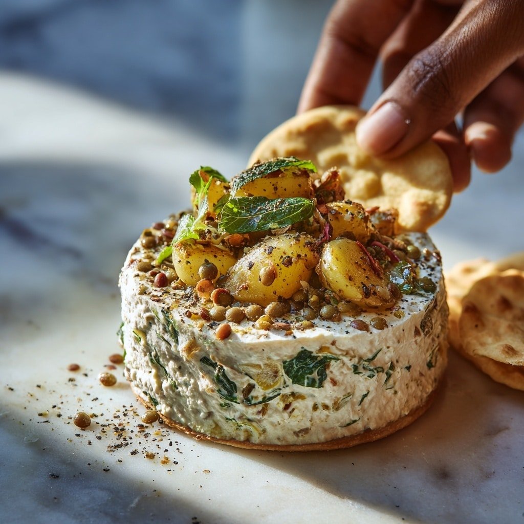 A close-up view of a dish with three main layers: the bottom has a white creamy sauce mixed with green leafy vegetables and black pepper specks, the middle layer shows soft yellow potato chunks, and the top layer is covered with small round brown lentils. On the right side, a woman's hand is picking up a piece of light brown crispy flatbread slightly dipped in the sauce. The dish is set on a white marbled surface, with sunlight highlighting the textures and colors of the food. Photo taken with an iphone --ar 1:1 --v 7 — Creamy Lentil and Sweet Potato Skillet, healthy lentil and sweet potato dinner, easy one-pan skillet recipe, cozy vegetarian skillet dish, nutritious sweet potato lentil meal