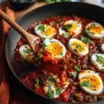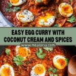 A flavorful and comforting Egg Curry recipe featuring boiled eggs simmered in a rich, spiced tomato and coconut cream sauce seasoned with traditional Indian spices and fresh bell peppers. Perfect served over boiled rice and garnished with fresh coriander, chili flakes, and nigella seeds, this dish is a great option for a hearty, home-cooked meal.