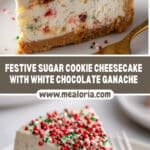 A festive Sugar Cookie Cheesecake featuring a sweet sugar cookie crust, creamy cheesecake filling studded with chopped sugar cookies, and topped with a smooth white chocolate ganache and holiday decorations. Perfect for holiday celebrations, this dessert combines classic cheesecake richness with sugar cookie flavors and a decorative touch.