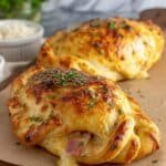 These Easy Ham and Cheese Calzones are a delicious and convenient meal featuring a golden, crispy crust filled with a savory blend of ham, mozzarella, ricotta, and Parmesan cheese seasoned with oregano and garlic powder. Perfectly baked until golden brown, these calzones offer a comforting, cheesy delight ideal for lunch, dinner, or a hearty snack.