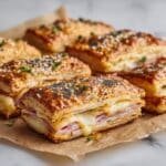 A delicious and easy-to-make Ham and Cheese Puff Pastry recipe featuring flaky puff pastry sheets filled with savory deli ham, melted Gruyère cheese, and optional Dijon mustard, finished with a golden egg wash and a sprinkle of everything bagel seasoning for added flavor.
