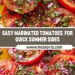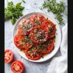 This Marinated Tomatoes recipe features ripe tomatoes beautifully infused with a vibrant blend of extra virgin olive oil, red grape vinegar, garlic, and fresh herbs. It’s a quick and fresh side dish or appetizer that requires no cooking, making it perfect for a light and flavorful addition to any meal.