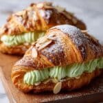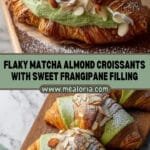 Delight in flaky, buttery croissants filled with a vibrant matcha almond frangipane and topped with crunchy sliced almonds. These Matcha Almond Croissants combine the rich flavors of almond paste with the earthy notes of ceremonial-grade matcha, enhanced by a delicate simple syrup glaze for moisture and sweetness. Perfect for breakfast or an afternoon treat, they are baked to golden perfection with a crispy exterior dusted with powdered sugar.