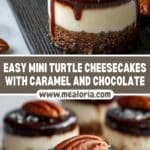 Delight in these Mini Turtle Cheesecakes featuring a crunchy graham cracker crust, creamy vanilla cheesecake filling, and decadent chocolate ganache topped with caramel, pecans, and sea salt. Perfect for individual servings, these bite-sized treats combine classic flavors in a visually appealing dessert.