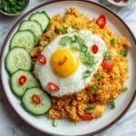 - Plate and garnish: Spoon the Nasi Goreng onto plates and top each with a fried egg, crispy at the edges but with a soft, runny yolk that melts into the rice. Add fresh garnishes like sliced tomatoes, crunchy cucumber, fried shallots, green onion, lime wedges, shrimp chips, and a dollop of sambal oelek for spicy heat. These add fresh textures and layers of brightness that elevate the entire dish.