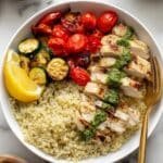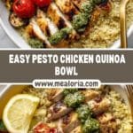 A flavorful and nutritious Pesto Chicken Quinoa Bowl featuring tender marinated chicken breasts, fluffy quinoa mixed with vibrant pesto, and sautéed cherry tomatoes and zucchini. This well-balanced bowl offers a perfect combination of protein, healthy fats, and fresh vegetables for a satisfying meal.