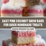 Delightful Pink Coconut Snow Bars featuring a soft and tender crumb with a subtle coconut flavor, perfect as a sweet treat or dessert. These bars combine a simple batter of flour, sugar, butter, eggs, and vanilla, baked to perfection with a light pink hue reminiscent of snowy coconut flakes.