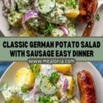 A classic German-inspired Potato Sausage Salad combining tender waxy potatoes and crunchy pickled cucumbers with a tangy mustard-mayo dressing, served alongside warm bockwurst sausages for a hearty and flavorful meal.