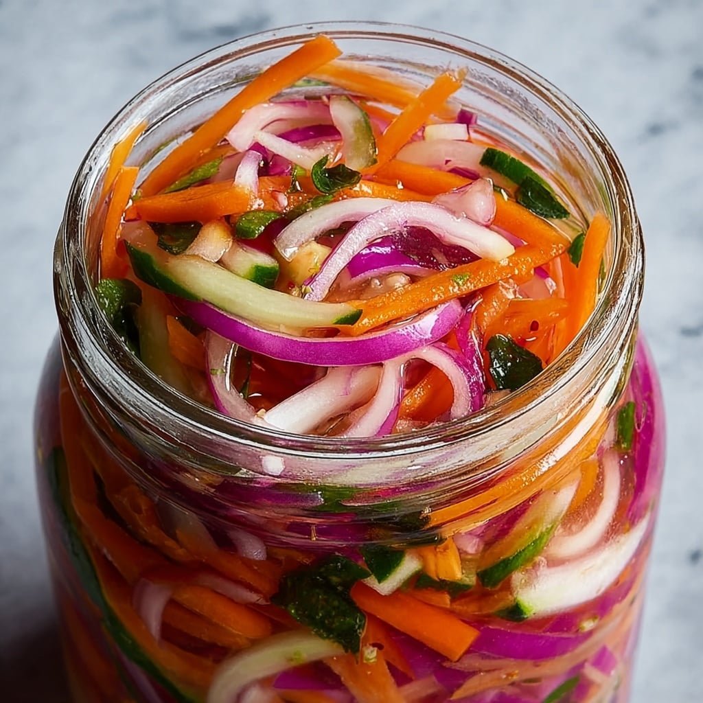 There’s something incredibly satisfying about the crisp snap of pickled vegetables straight from the fridge. I love how a simple Quick Pickled Vegetables Recipe can brighten up any meal with its tangy zing and fresh crunch. It’s like a little jar of sunshine that livens up sandwiches, salads, or even a humble cheese plate. You’ll notice that this recipe is wonderfully easy and quick to pull together—perfect for those busy evenings when you want a pop of flavor without the fuss. The mix of shredded carrots, radish, and crisp cucumber matches beautifully with a lightly scented vinegar brine. I can almost hear the satisfying crunch as you bite into each vibrant piece. What I appreciate most is how this Quick Pickled Vegetables Recipe feels like an instant upgrade, turning ordinary raw veggies into something velvety, tangy, and just lightly sweet. Plus, it’s a fantastic way to sneak some extra veggies into your day with minimal effort.Standout Details