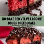 - Serve: Once the cheesecake is set, remove it from the springform pan and slice to serve. Enjoy this rich, creamy, and decadent no-bake red velvet cookie dough cheesecake!