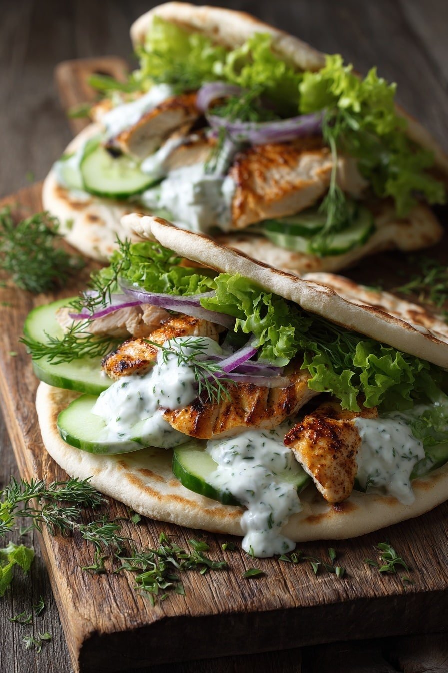- To assemble, spread a generous spoonful of chilled tzatziki inside each pita. Layer in the golden chicken and tender-roasted vegetables, then sprinkle with feta cheese, Kalamata olives, and fresh parsley for that final burst of flavor and texture.
