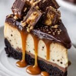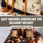 This Decadent Snickers Cheesecake combines a rich chocolate cookie crust with a creamy cheesecake filling studded with chopped Snickers bars, caramel, and chocolate sauce. Baked in a water bath for a smooth and creamy texture, it is a luscious dessert perfect for chocolate and candy lovers alike, topped generously with extra Snickers pieces and drizzles of caramel and chocolate.