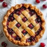A cherry pie with a golden brown crust that has a crimped edge around the outside. The top crust is a lattice pattern made of light golden strips, showing dark red, glossy cherry filling that looks thick and glossy with whole cherries visible underneath. The pie sits on a white plate placed on a white marbled surface with fresh cherries scattered around it. There is a light dusting of white sugar or powdered sugar on top of the crust. Photo taken with an iphone --ar 4:5 --v 7 — Sparkling Sugared Cranberries, holiday cranberry garnishes, festive cranberry decorations, sugared cranberry recipe, Christmas cranberry treats
