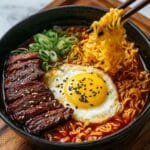 This Spicy Korean Ramen with Beef and Creamy Sauce combines tender marinated ribeye steak with flavorful Korean spices, simmered ramen noodles, and a rich, creamy mayonnaise sauce. The dish features a perfect balance of heat from gochujang and gochugaru, umami from the soy-based marinade and broth, and a luxurious texture from the mayo-based sauce. Ideal for a comforting yet elevated instant ramen meal.