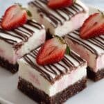 These Strawberry Cheesecake Bars with a fudgy brownie crust combine the rich, chocolatey base of a classic brownie with a creamy, tangy cheesecake layer swirled with fresh strawberry puree. Topped with melted chocolate and fresh strawberry halves, these bars offer a perfect balance of decadent flavors and beautiful presentation, ideal for dessert lovers seeking an indulgent treat with a fruity twist.