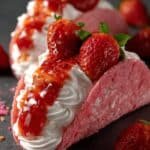 The image shows two pink crumb-coated taco-shaped shells placed on a dark smooth surface, each shell filled with a thick, white swirled cream layer. On top of the cream, there is a bright red strawberry sauce with visible chunks, and each taco is garnished with two halved fresh strawberries with green leaves still attached. Around the tacos, there are small scattered crumbs in pink and light brown colors. The closer taco is in sharp focus, showing fine texture details, while the one behind is softly blurred. photo taken with an iphone --ar 2:3 --v 7 — Strawberry Cookie Boats, strawberry dessert recipes, easy fruity cookies, homemade strawberry treats, adorable strawberry desserts