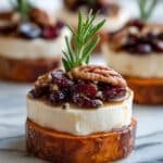Sweet Potato Rounds with Brie, Cranberry & Pecans offer a delightful combination of flavors and textures perfect for a festive appetizer or snack. Roasted sweet potato slices are topped with creamy melted brie, tart cranberries, and crunchy pecans, creating a warm, colorful bite that’s both savory and sweet.