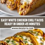 These Best White Chicken Chili Tacos feature a creamy, mildly spiced white chili sauce combined with shredded chicken, corn, and green onions, all wrapped in warm corn tortillas and finished with melted mozzarella cheese. Perfectly baked until golden and bubbly, these tacos offer a delicious and comforting twist on classic chicken chili.